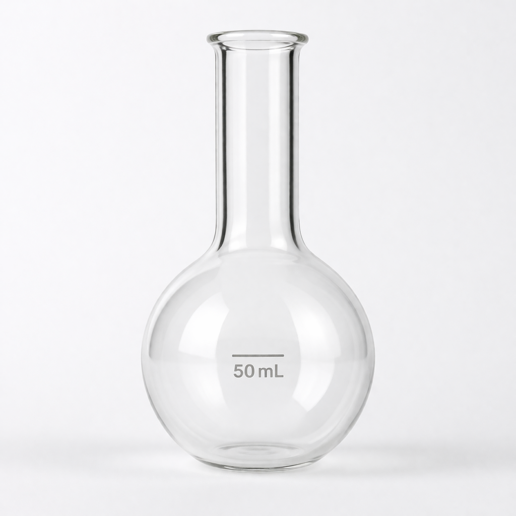 The AVAIN LABS Round Bottom Flask Narrow Neck 50 mL (AL-260-1A) is a high-quality laboratory glassware solution designed for efficient heating, mixing, and chemical reactions. Manufactured from 33 expansion borosilicate glass, this flask conforms to USP Type I and ASTM E438 Type I, Class B standards, ensuring exceptional thermal resistance, chemical durability, and long-lasting performance.