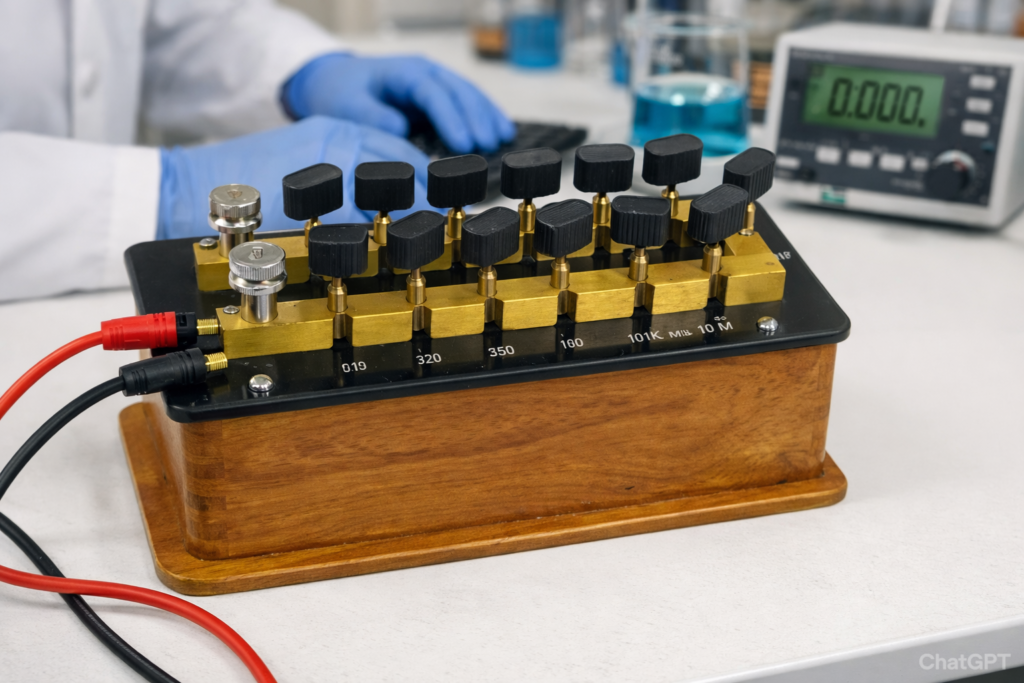 Resistance Box (Brass) Plug Type is a precision electrical laboratory instrument designed for accurate resistance measurement and advanced circuit experimentation. Manufactured using high-quality constantan coil wire and mounted on robust 9mm thick brass blocks, this resistance box ensures stable resistance values, excellent conductivity, and long operational life. With a wide selectable resistance range of 1 Ohm to 10000 Ohm, this plug-type resistance box allows smooth and secure brass plug insertion for quick and precise resistance adjustments. The constantan wire provides a low temperature coefficient, minimizing resistance changes due to temperature variations and ensuring consistent and reliable readings. Designed for routine laboratory and academic use, this resistance box is ideal for physics laboratories, engineering colleges, technical institutes, and electrical testing applications. The durable brass construction enhances reliability and ensures dependable performance during repeated practical experiments.