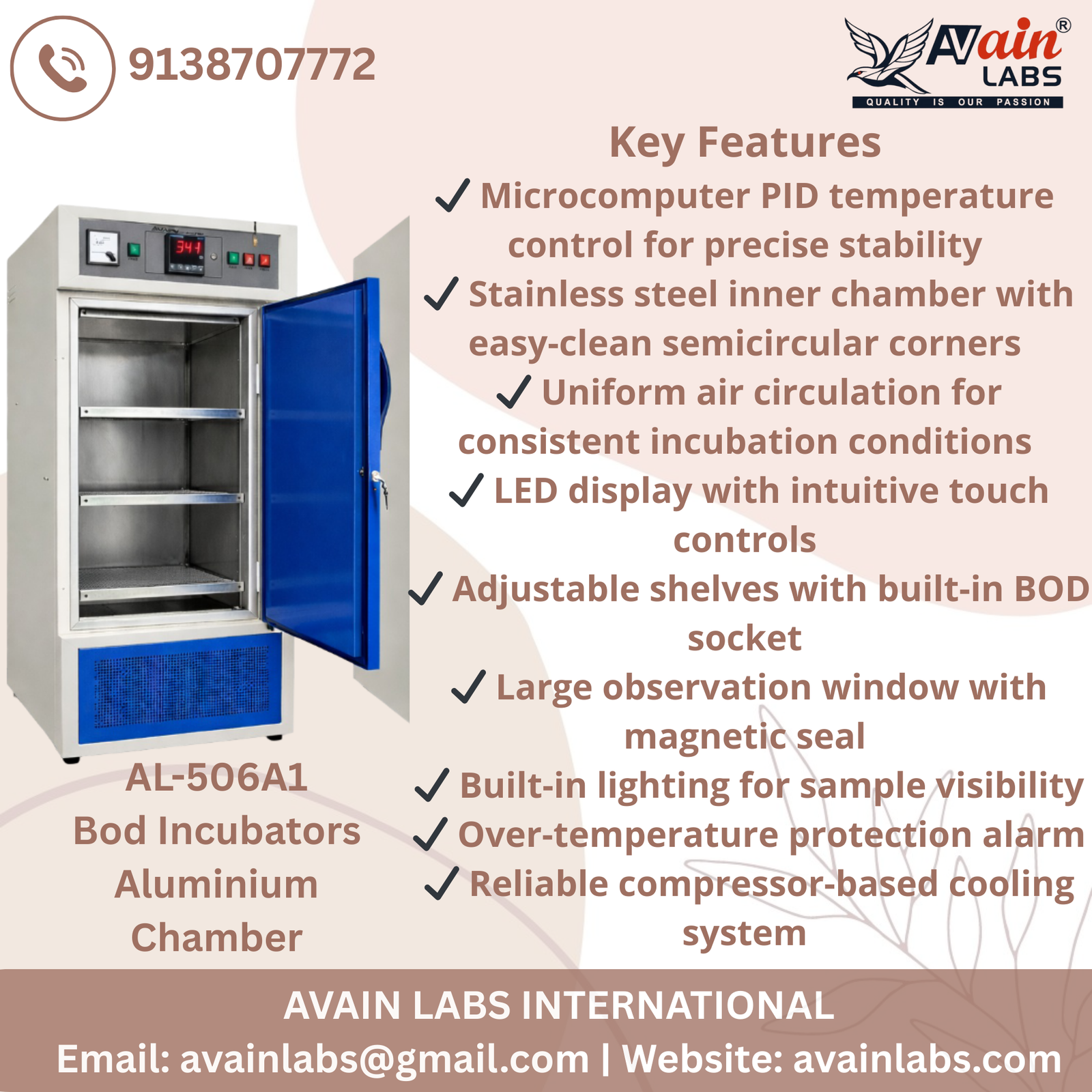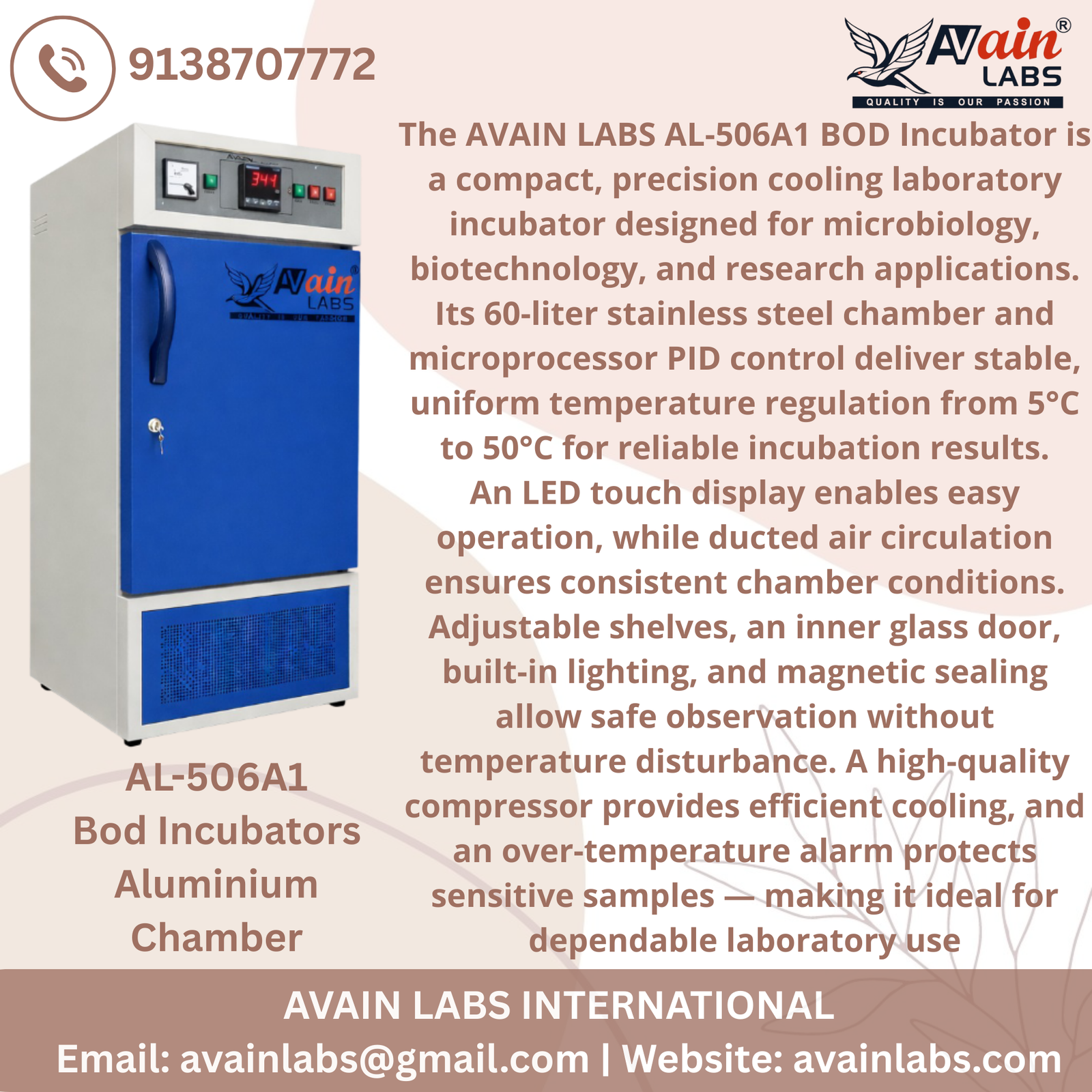 The AVAIN LABS BOD Incubator AL-506A1 is a precision-engineered laboratory incubator designed for Biochemical Oxygen Demand (BOD) testing, microbiological studies, and environmental research. With its compact 350x350x350 mm chamber size, this incubator delivers reliable performance, accurate temperature control, and uniform conditions essential for sensitive laboratory applications.