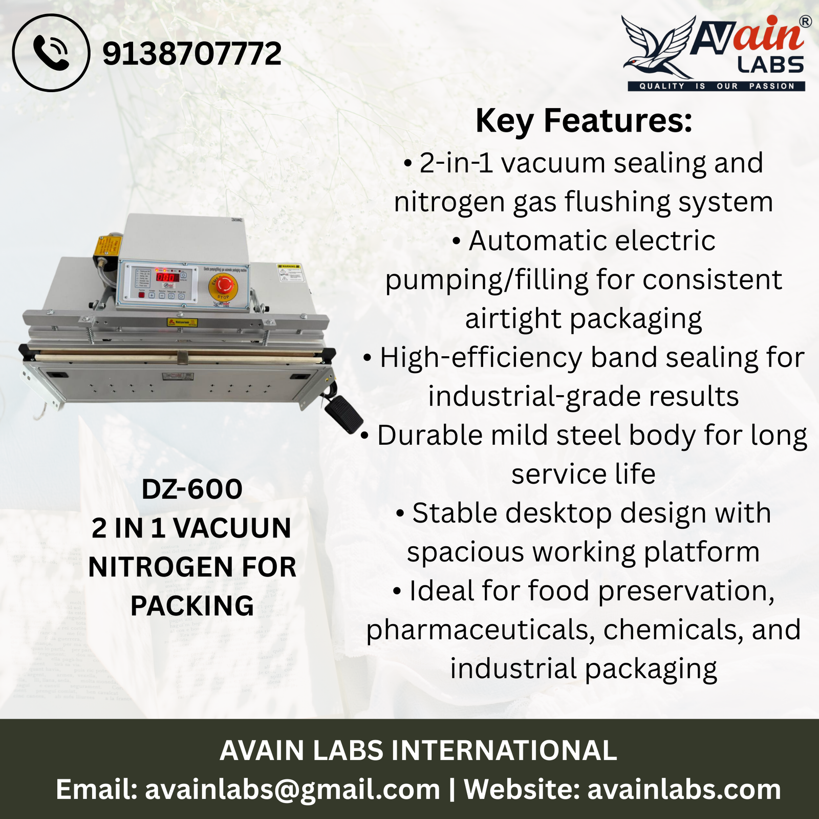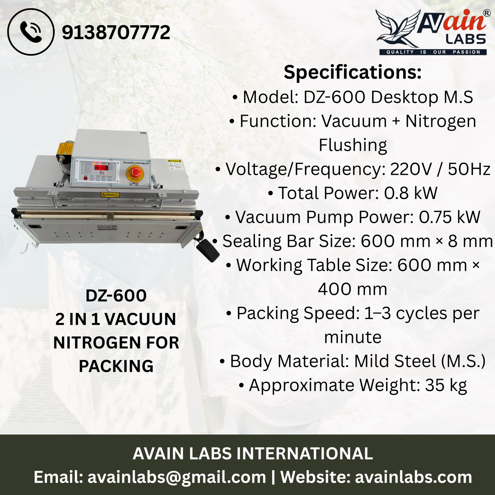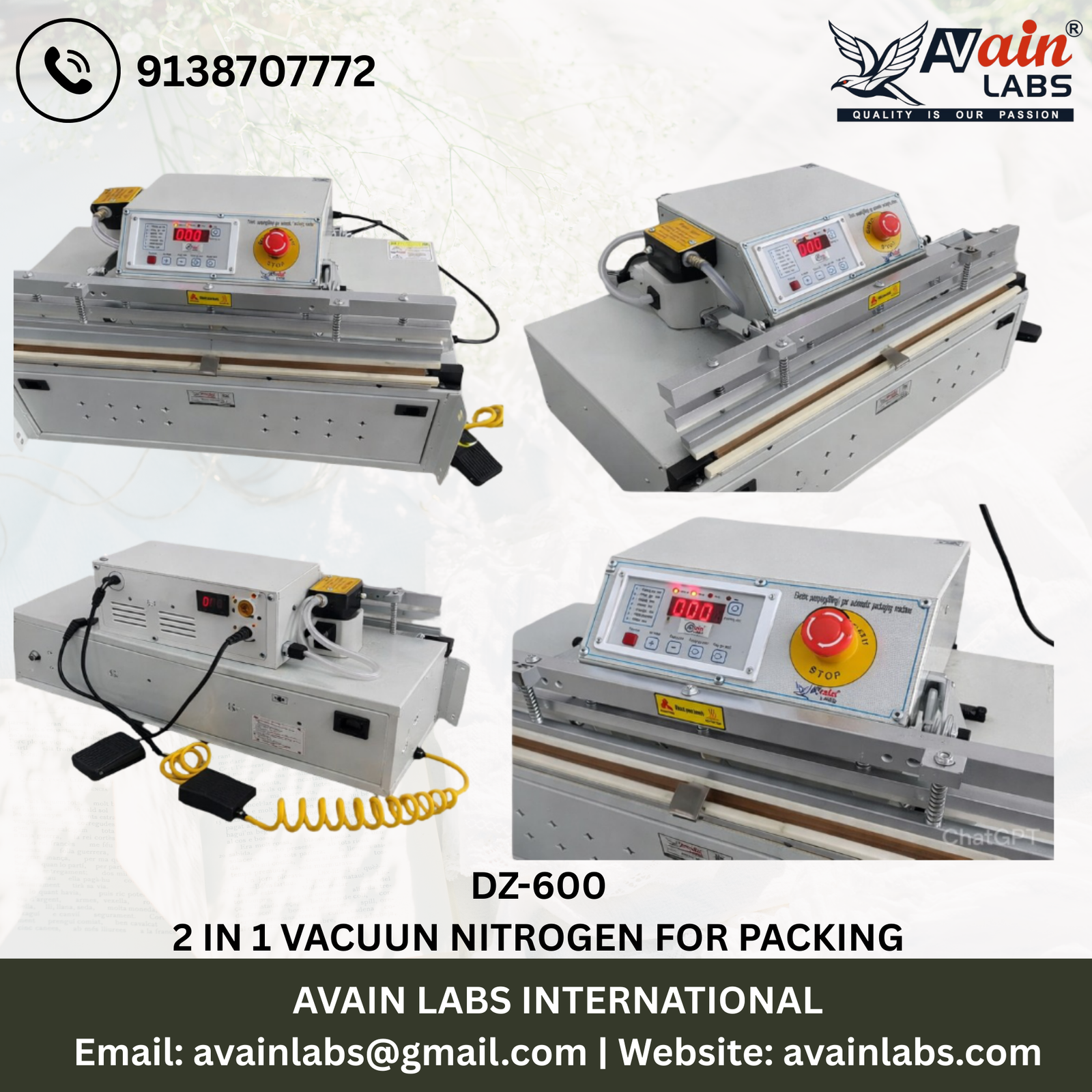 The AVAIN LABS Electric Pumping Filling Gas Machine DZ-600 (2-in-1 Band Sealer with Nitrogen Flushing & Vacuum System) is a high-performance packaging solution designed for advanced sealing and preservation needs. This combined band sealer with nitrogen flushing and vacuum function ensures extended product shelf life by removing oxygen and filling inert gas before sealing.