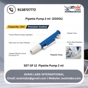 The AVAIN LABS Pipette Pump is a high-performance laboratory accessory designed for accurate, comfortable, and efficient liquid handling. Manufactured from high-quality Polypropylene (PP) and Silicone, this pipette pump is fully autoclavable, ensuring safe sterilization and repeated use in demanding laboratory environments.
