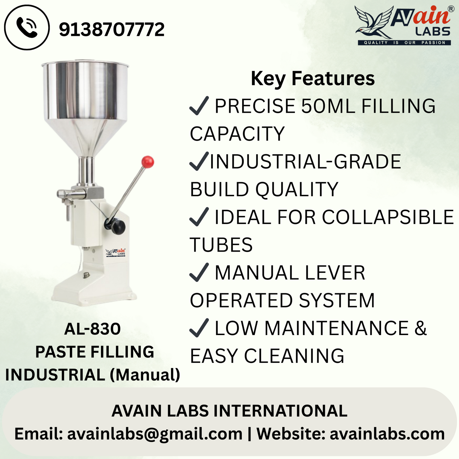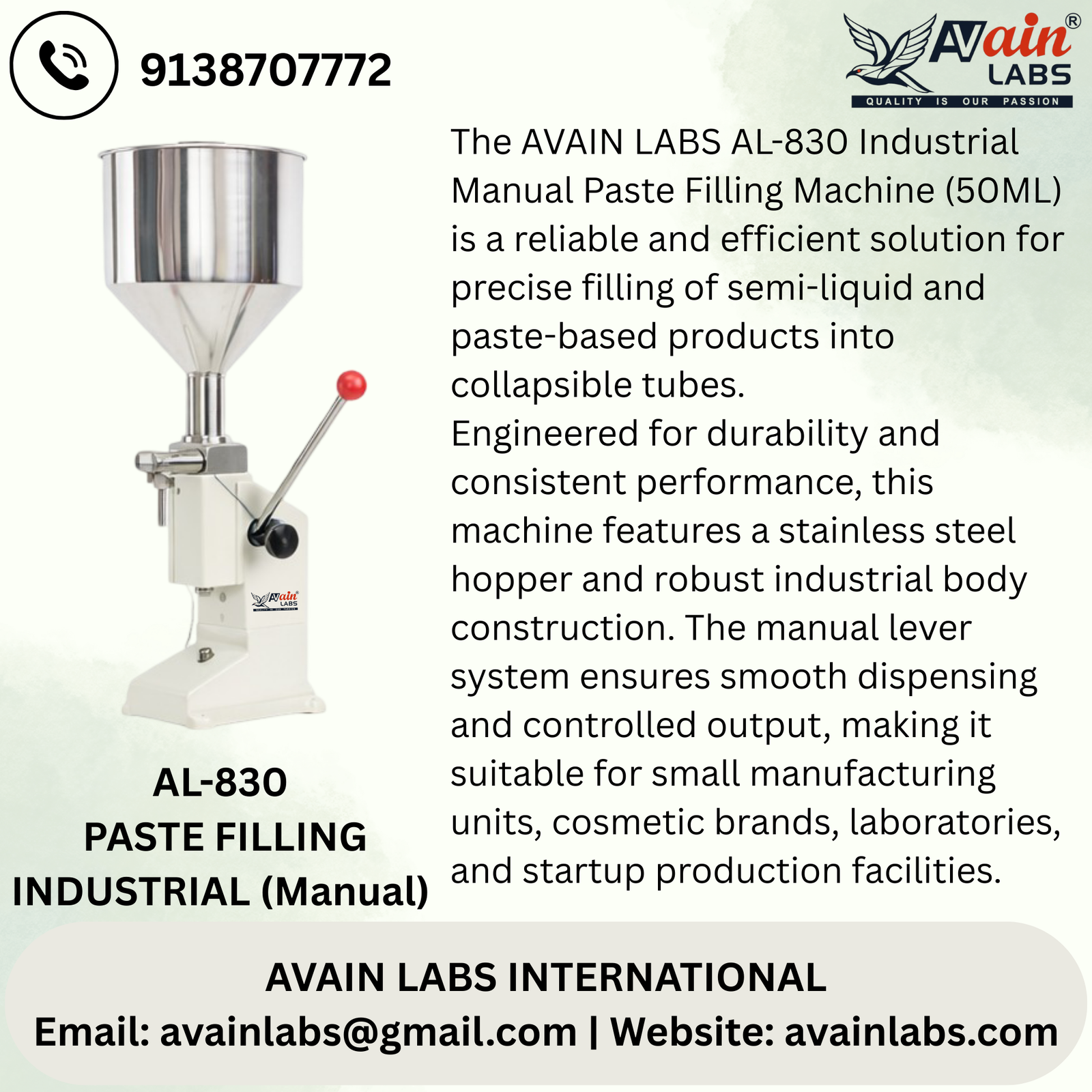 AVAIN LABS PASTE FILLING MACHINE INDUSTRIAL (Manual) AL-830