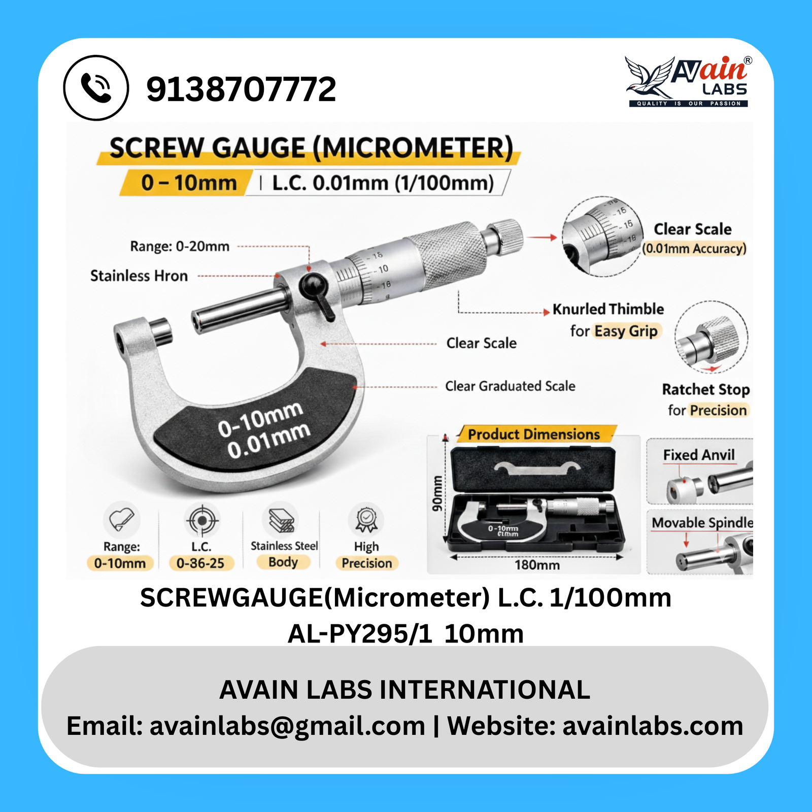 The AVAIN LABS Screw Gauge (Micrometer) AL-PY295-1 is a precision measuring instrument designed for accurate measurement of small dimensions such as thickness, diameter, and wire gauge. With a least count (L.C.) of 0.01 mm (1/100 mm) and a measuring range of 0–10 mm, this micrometer screw gauge for laboratory use is ideal for students, educators, and professionals in physics and engineering fields.