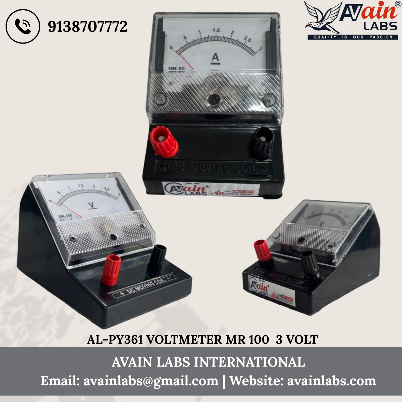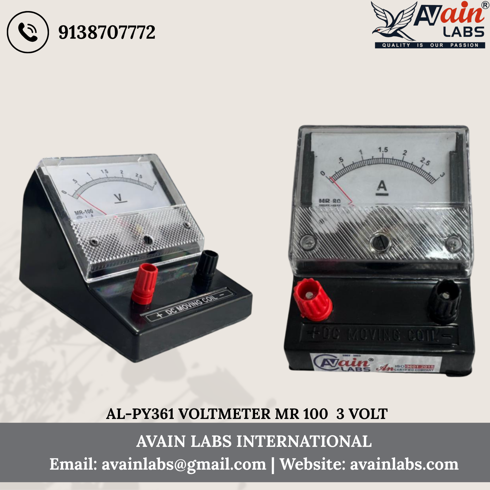 VOLTMETER (MR-100) Avain labs Make (Any One Range) Square Dial DC with stand AL-PY361-1